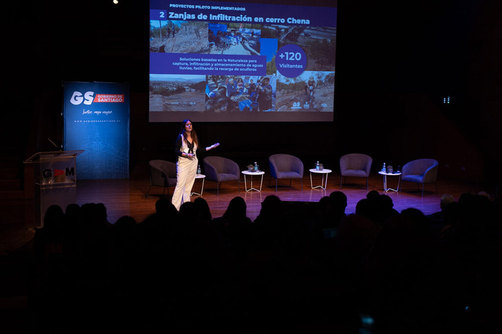 Como demostración de este impulso hacia la “acción colaborativa”, la directora de Escenarios Hídricos 2030 de Fundación Chile, Ulrike Broschek, expuso los proyectos ejecutados en el marco de la iniciativa Maipo Resiliente y que serán la base del futuro trabajo del Organismo de Cuenca para alcanzar la seguridad hídrica: “Con el objetivo de demostrar que podemos avanzar a la implementación del portafolio y probar la efectividad de las soluciones propuestas, el Gobierno de Santiago invirtió en la ejecución de los primeros tres proyectos replicables. El primero estuvo destinado a la eficiencia hídrica y culminó con la entrega de más de 14 mil dispositivos para el ahorro de agua en cinco comunas; en tanto, el segundo tuvo como objetivo la recarga del acuífero, a través de obras de infiltración en el cerro Chena, de San Bernardo. Un tercer proyecto de jardines de lluvia en la ribera del canal San Carlos, está en proceso de ejecución, y va en línea con la actual tendencia de las ciudades esponja, que permiten contener inundaciones, islas de calor y a la vez recargar las napas subterráneas”.