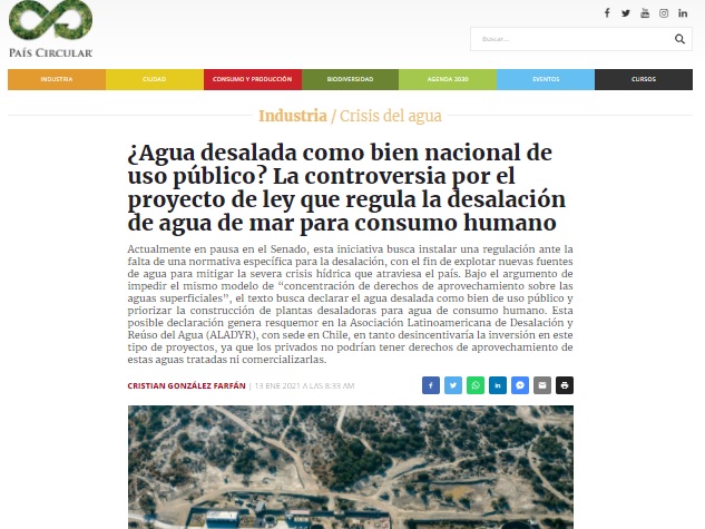 En la Asociación Latinoamericana de Desalación y Reúso del Agua (ALADYR), nacida a fines del año 2010 en Chile, el proyecto de ley en cuestión genera resquemores. En un seminario organizado por esta asociación gremial en noviembre de 2020 arguyeron que la iniciativa parlamentaria “opera en sentido contrario” a lo que debiesen ser -dicen ellos- políticas públicas de fomento a la desalación.