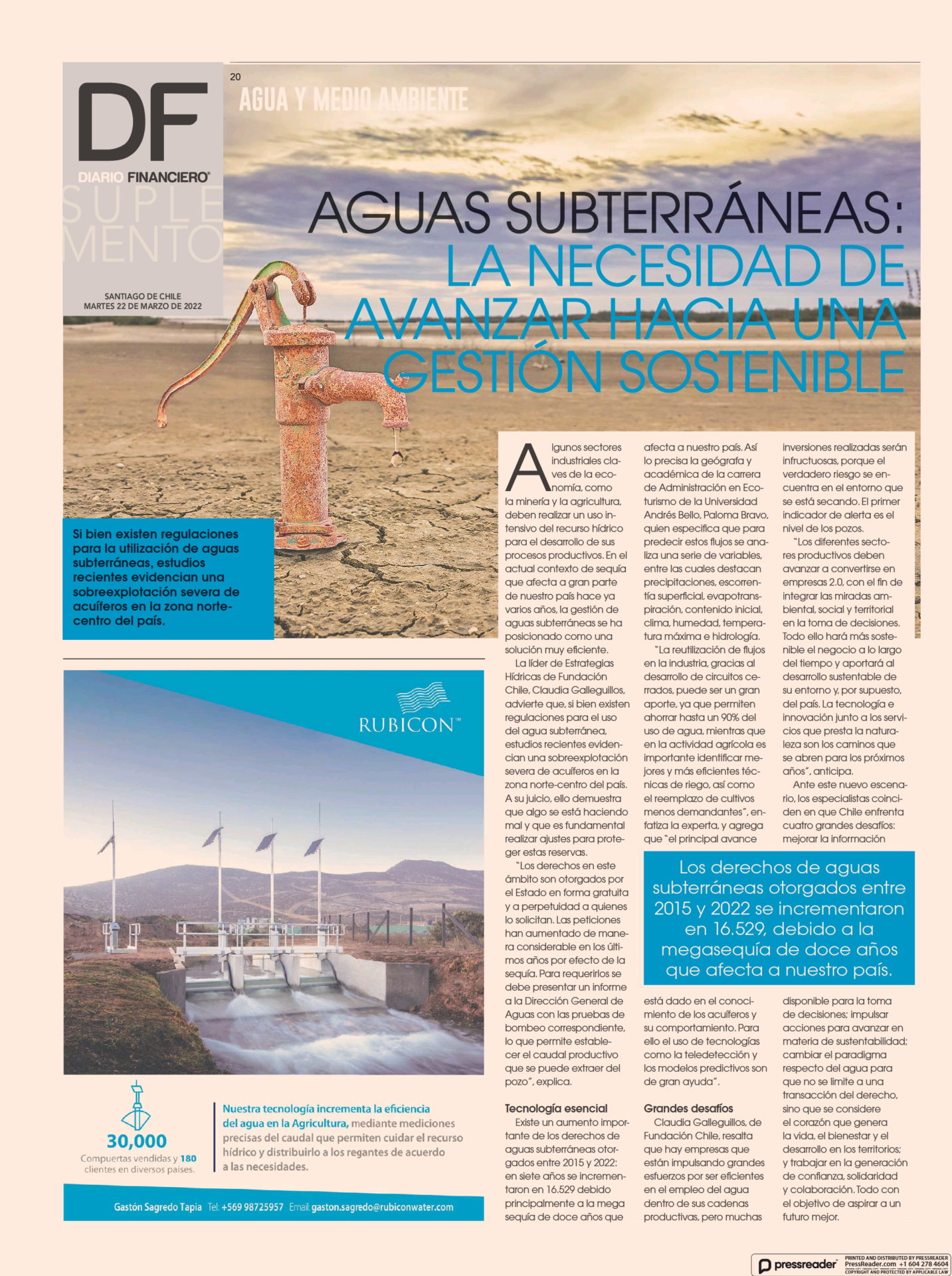 - En entrevista con el Diario Financiero, la líder de Estrategias Hídricas de Fundación Chile y Escenarios Hídricos 2030, Claudia Galleguillos, se refiere a la importancia de las aguas subterráneas, que este año fueron el tema central de la conmemoración del Día Mundial del Agua.