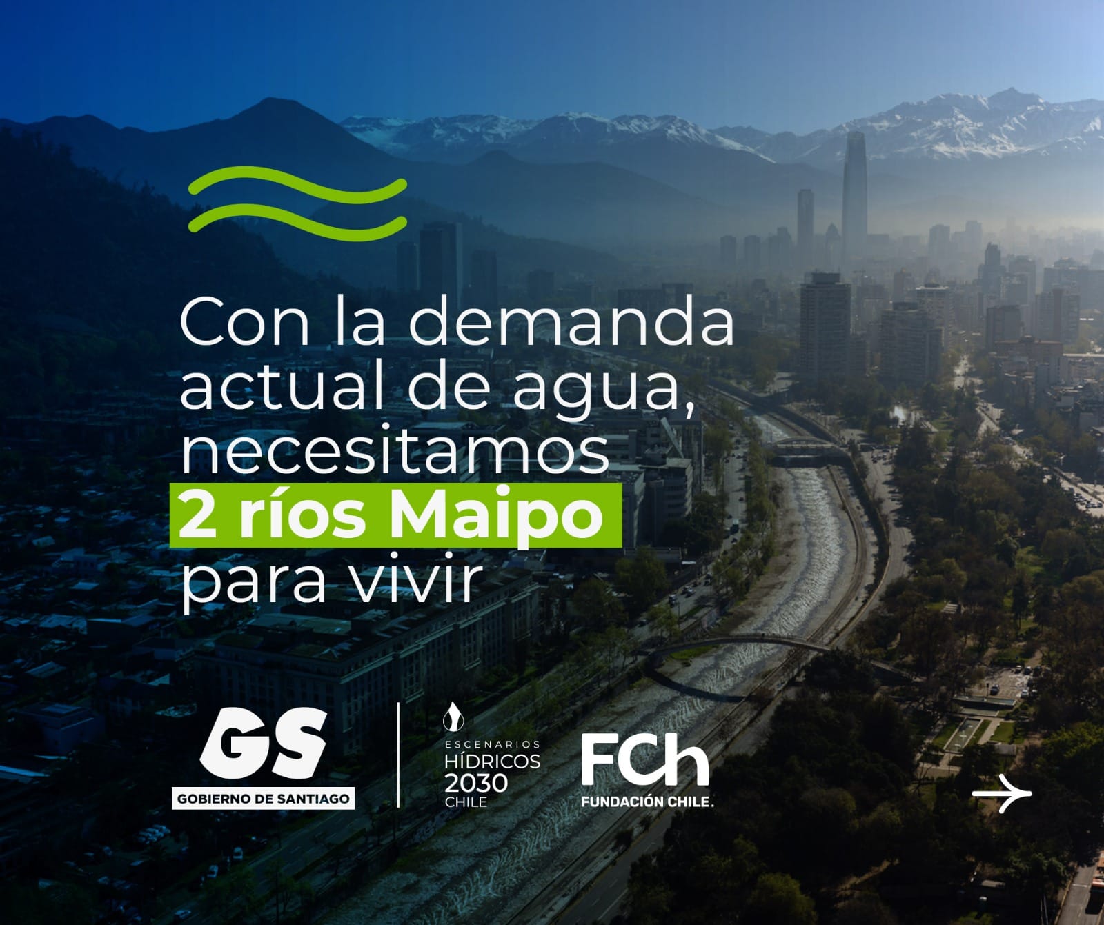 Un solo río Maipo ya no alcanza para sostener la huella hídrica de la cuenca. Según Escenarios Hídricos 2030 (2022) de Fundación Chile, la brecha en la cuenca del Maipo hoy alcanza 63 m3/s, lo que equivale a un río Maipo adicional. Se estima que esta brecha aumente a 92 m3/s en el 2050, como consecuencia del Cambio Climático.
