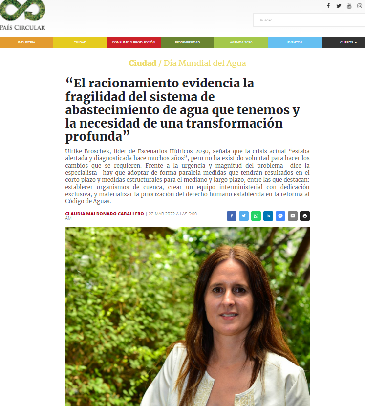 - En esta entrevista publicada el 22 de marzo en País Circular, Ulrike Broschek, líder de Escenarios Hídricos 2030, señala que la crisis actual “estaba alertada y diagnosticada hace muchos años”, pero no ha existido voluntad para hacer los cambios que se requieren. Frente a la urgencia y magnitud del problema -dice la especialista- hay que adoptar de forma paralela medidas que tendrán resultados en el corto plazo y medidas estructurales para el mediano y largo plazo, entre las que destacan: establecer organismos de cuenca, crear un equipo interministerial con dedicación exclusiva, y materializar la priorización del derecho humano establecida en la reforma al Código de Aguas.