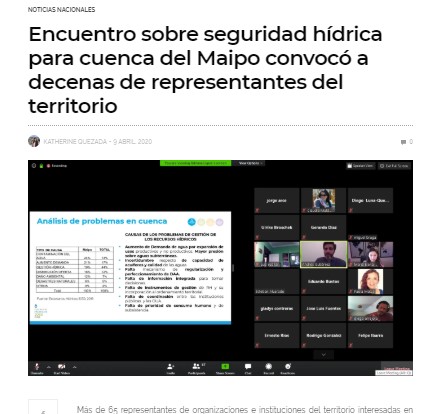 La coordinadora de EH2030 para la cuenca del río Maipo, Ulrike Broschek, explicó que es necesario seguir avanzando en este proceso, a pesar de las circunstancias que vive el país. “La urgencia del problema del agua nos obliga a mantener todos los esfuerzos para promover la pronta implementación de medidas que nos lleven a lograr la sustentabilidad del recurso. Es por eso que, usando la tecnología a nuestro alcance, seguimos adelante con este taller, constatando que existe un gran interés ya que tuvimos representantes de todo el territorio desde la zona más alta hasta la desembocadura”, explicó.