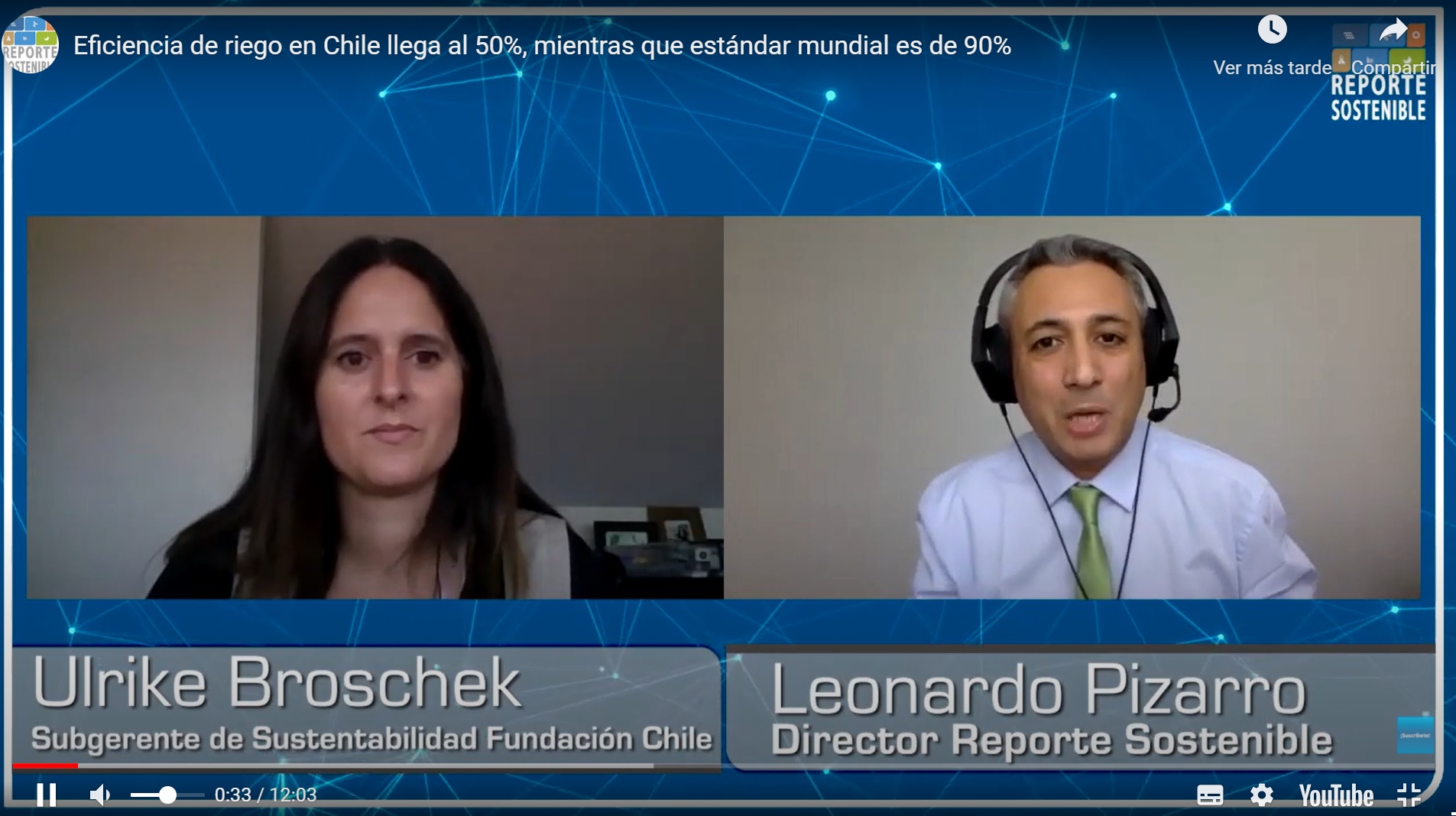 - El portal Reporte Sostenible entrevistó a Ulrike Broschek en su calidad de subgerente de Sustentabilidad de Fundación Chile y líder de Escenarios Hídricos 2030. Durante la conversación con el director del portal, Leonardo Pizarro, Broschek explicó de qué se trata el Acuerdo de Producción Limpia Certificado Azul, firmado el 22 de marzo, fecha en que se conmemora el Día Internacional del Agua. Asimismo, abordó la necesidad de hacer un uso mucho más eficiente de los recursos hídricos en los sectores productivos; en ese sentido, mencionó que la eficiencia de riego en Chile es en promedio de 50%, en circunstancias que a nivel mundial lleva al 90%.
