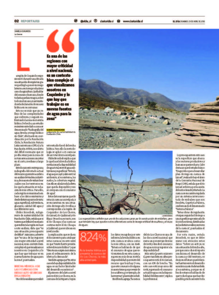 - En este reportaje, el Diario El Día de La Serena expone las conclusiones a las que llegó EH2030 en relación a la región de Coquimbo y que fueron publicadas en Radiografía del agua: brecha y riesgo hídrico en Chile.