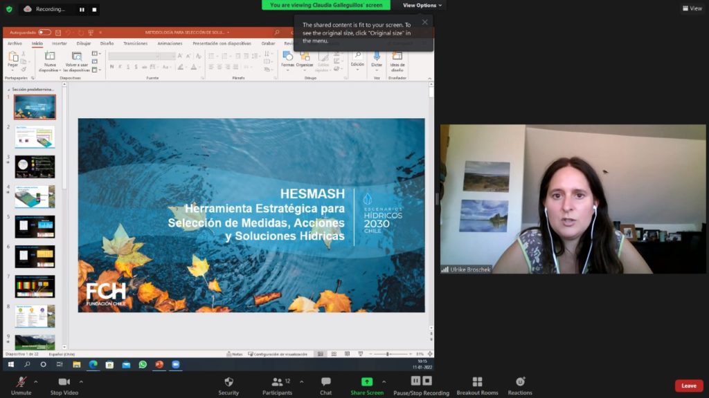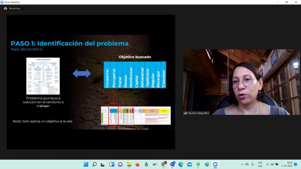 La encargada de presentar la metodología fue Claudia Galleguillos, líder de Estrategias Hídricas de Fundación Chile y coordinadora para la cuenca de Maule de EH2030, quien explicó que “el objetivo principal de la herramienta es contribuir a tomar mejores decisiones respecto a las soluciones que se seleccionan para hacer gestión hídrica”. Agregó que para el diseño se consideró especialmente las falencias observadas por la iniciativa desde su creación en 2016, con la intención de abrir la visión respecto de soluciones que se usan a nivel internacional con excelentes resultados y que en Chile son poco conocidas.