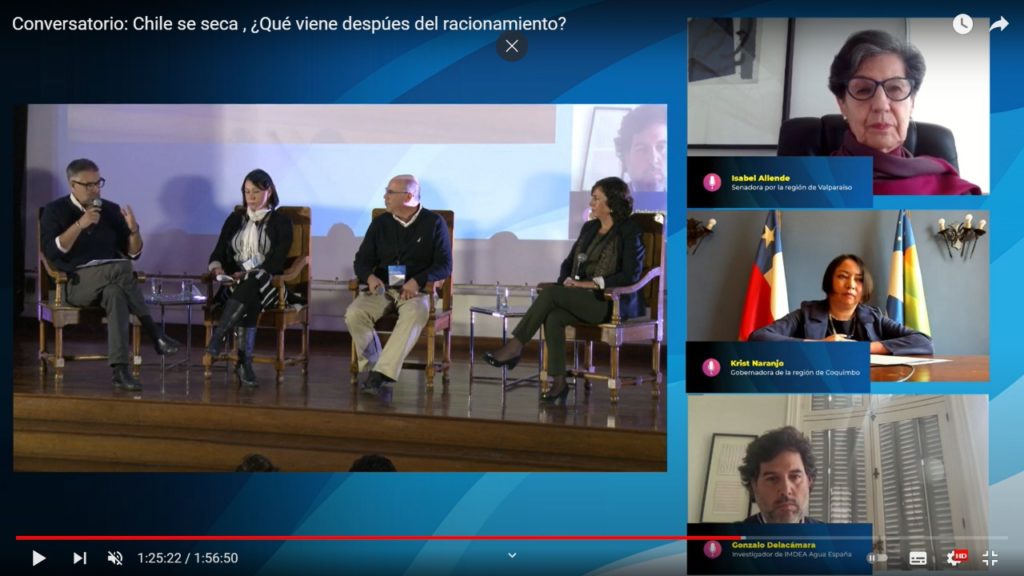- Es así como la senadora Isabel Allende; la gobernadora de Coquimbo, Krist Naranjo; el presidente de Fedefruta, Jorge Valenzuela; la directora (R ) de la ASCC, Ximena Ruz, el experto español Gonzalo Delacámara y la líder de estrategias hídricas de FCh, Claudia Galleguillos. participaron en el panel de conversación “Chile se seca: ¿qué viene después del racionamiento?”.