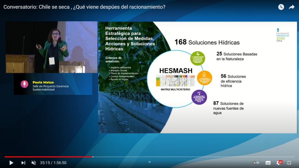 Respecto a la HESMASH, fue presentada por Paola Matus, jefa de proyecto de EH2030, quien subrayó la versatilidad de este instrumento, “pues se puede utilizar a cualquier escala, desde buscar soluciones para un problema puntual de algún sector productivo específico, hasta buscar un conjunto de soluciones para territorios más extensos que poseen variados problemas, logrando obtener un comparativo de varias soluciones para un mismo problema”.