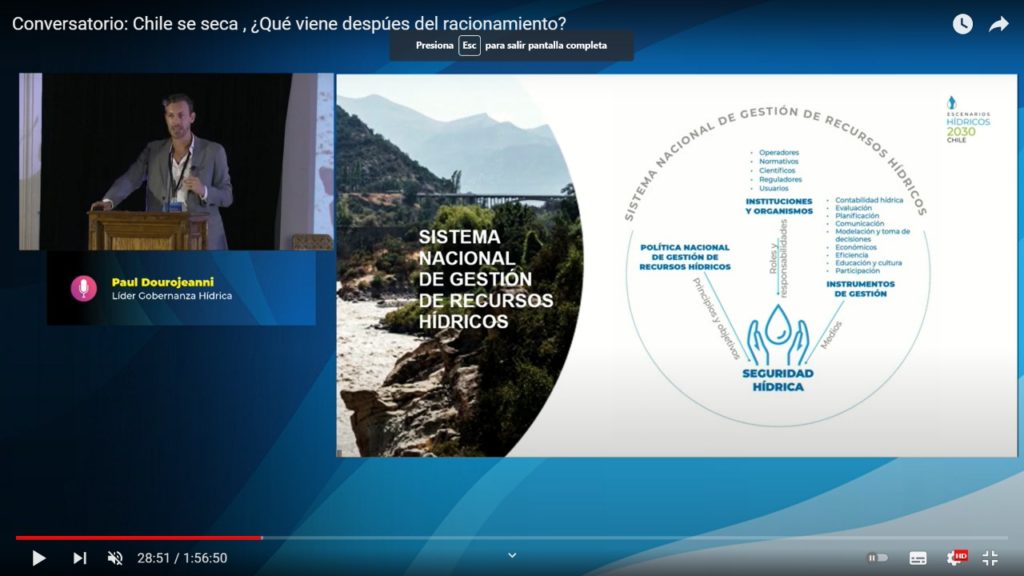 El seminario, que se realizó en la Sala América de la Biblioteca Nacional, fue organizado por Escenarios Hídricos 2030 (EH2030), una iniciativa coordinada por Fundación Chile, Fundación Futuro Latinoamericano y Fundación Avina. Al comienzo de la actividad se proyectó un video de saludo enviado por el ministro de Agricultura, Esteban Valenzuela Van Treek, quien subrayó la necesidad de que exista «una agencia que articule los distintos servicios que tienen que ver con la integralidad de los problemas del agua, como EH2030 lo ha sugerido«.