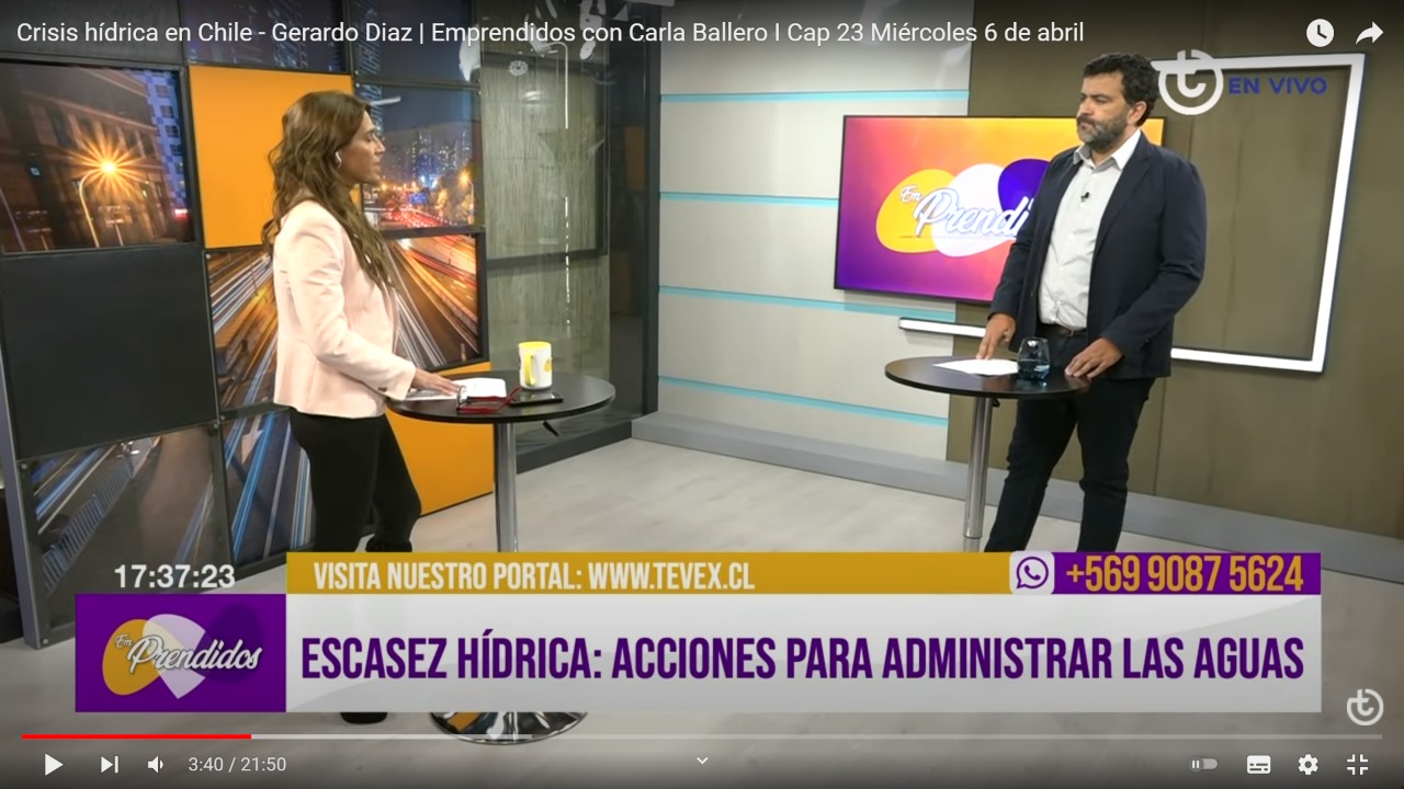 En entrevista con el programa Emprendidos, del canal Tevex, Gerardo Díaz, jefe de proyectos de Fundación Chile e integrante del equipo de Escenarios Hídricos 2030, explicó las estrategias que se deben adoptar para hacer frente a la escasez hídrica de forma eficiente y sustentable, en momentos en que se está analizando un posible racionamiento en el consumo de la Región Metropolitana.