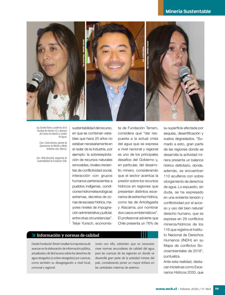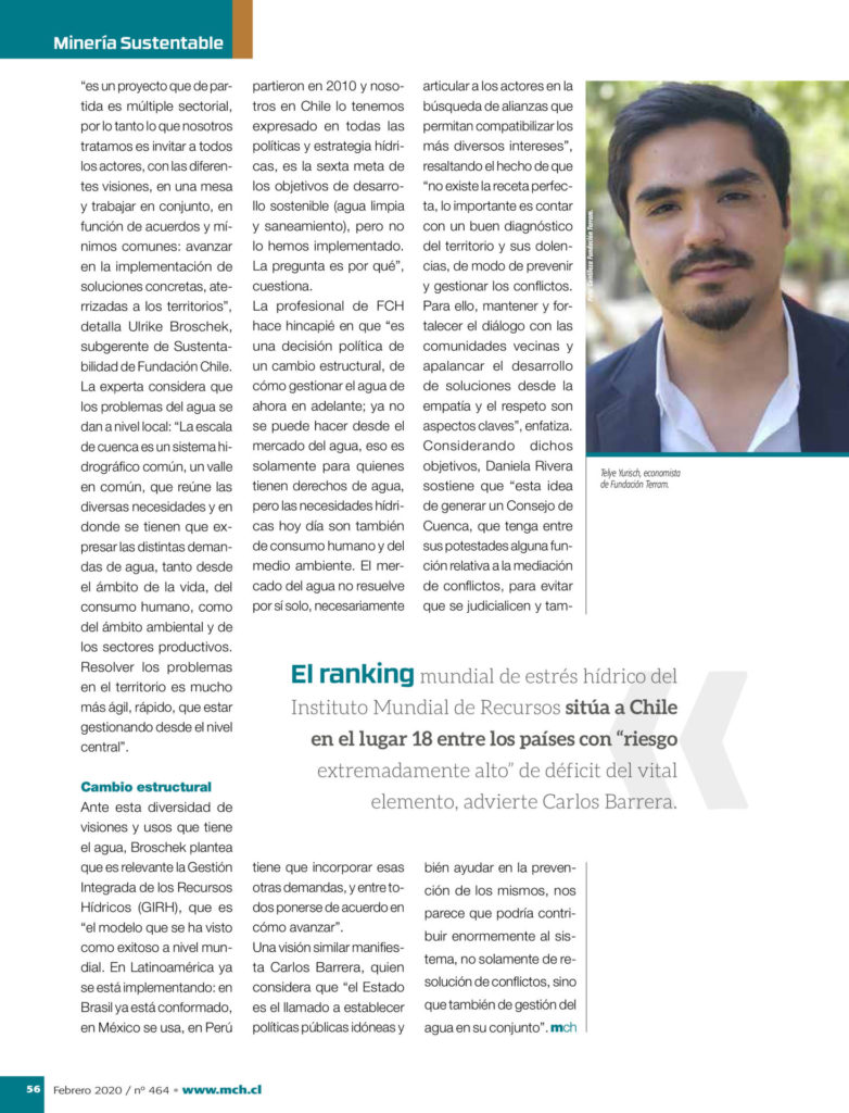 - Para este reportaje, la Revista Minería Chilena entrevistó a diversos especialistas, entre los que destaca la líder de EH2030 Ulrike Broschek. En el texto se aborda la urgencia de modificar el sistema de gestión del agua en Chile.