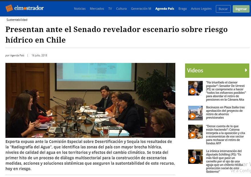 - Elmostrador destacó la presentación que el equipo de Escenarios Hídricos 2030 realizó ante la Comisión Especial sobre Desertificación y Sequía del Senado sobre el libro Radiografía del Agua: Brecha y Riesgo Hídrico en Chile