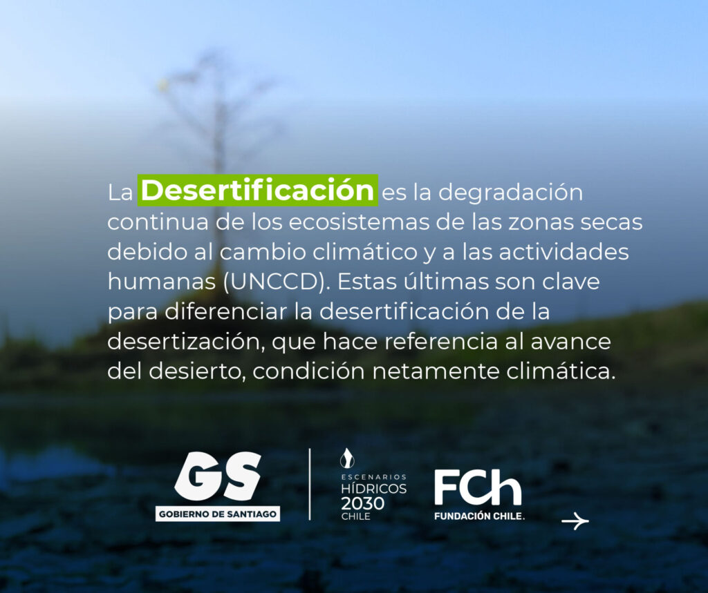 La desertificación es la degradación continua de los ecosistemas de las zonas secas debido al cambio climático y a las actividades humanas (UNCCD). Estas últimas son clave para diferenciar la desertificación de la desertización, que hace referencia al avance del desierto, condición netamente climática.