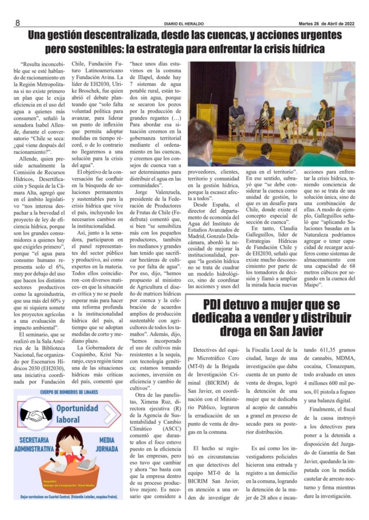 - Artículo publicado por el diario El Heraldo, del Maule Sur, relevando el conversatorio «Chile se seca: ¿qué viene después del racionamiento?», organizado por EH2030 y realizado el 21 de abril de 2022.