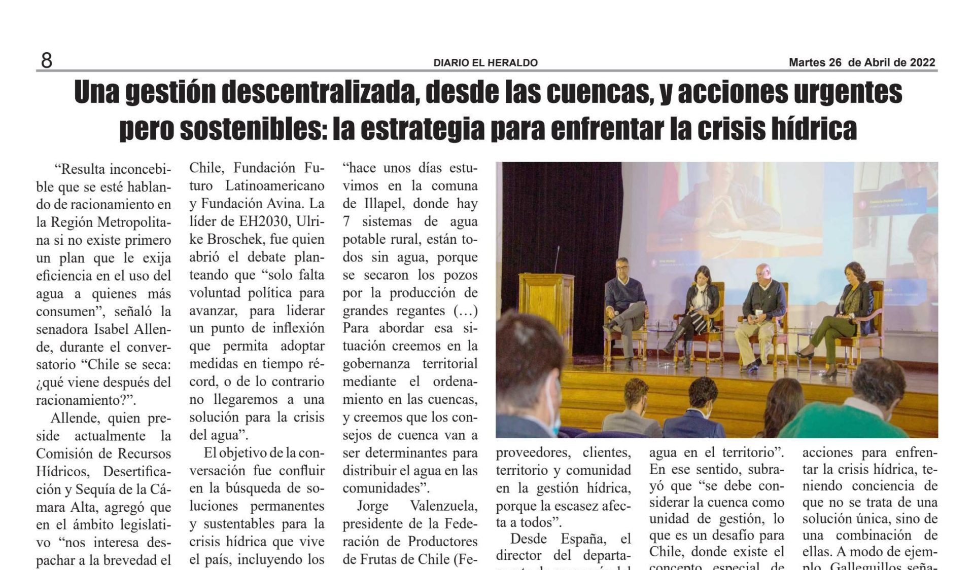 - Artículo publicado por el diario El Heraldo, del Maule Sur, relevando el conversatorio «Chile se seca: ¿qué viene después del racionamiento?», organizado por EH2030 y realizado el 21 de abril de 2022.